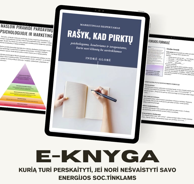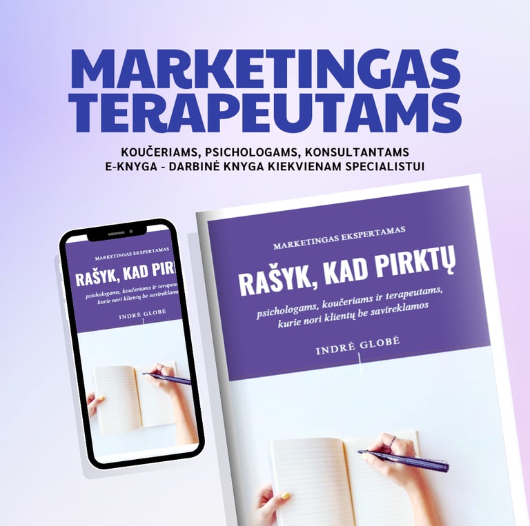 Praktinė e-knyga apie specializuotą marketingą koučeriams, terapeutams, psichologams - su formulėmis, ChatGPT užklausomis ir pavyzdžiais, kurie padės kalbėti apie savo darbą taip, kad klientai patys norėtų pirkti.