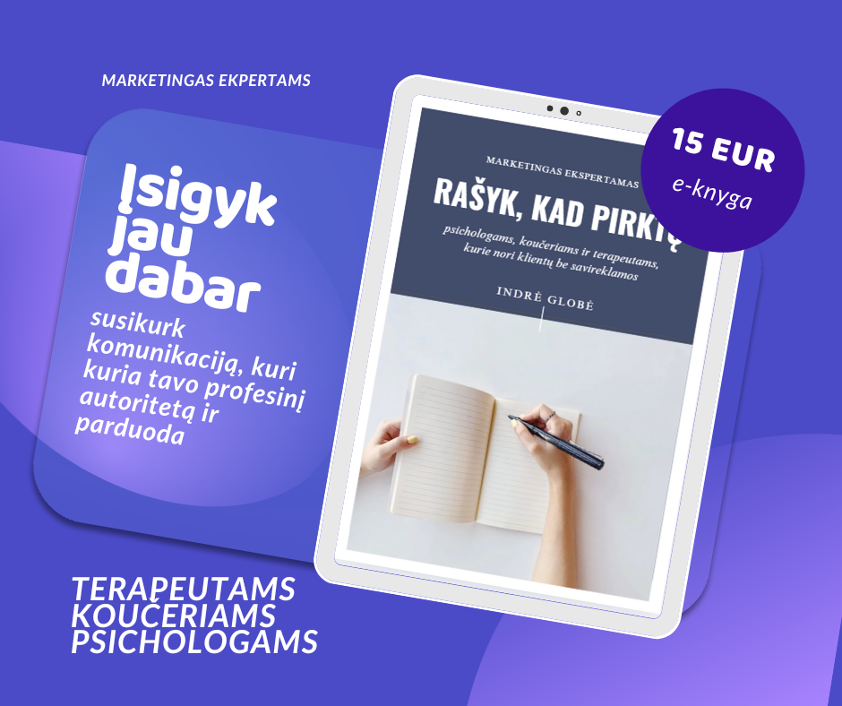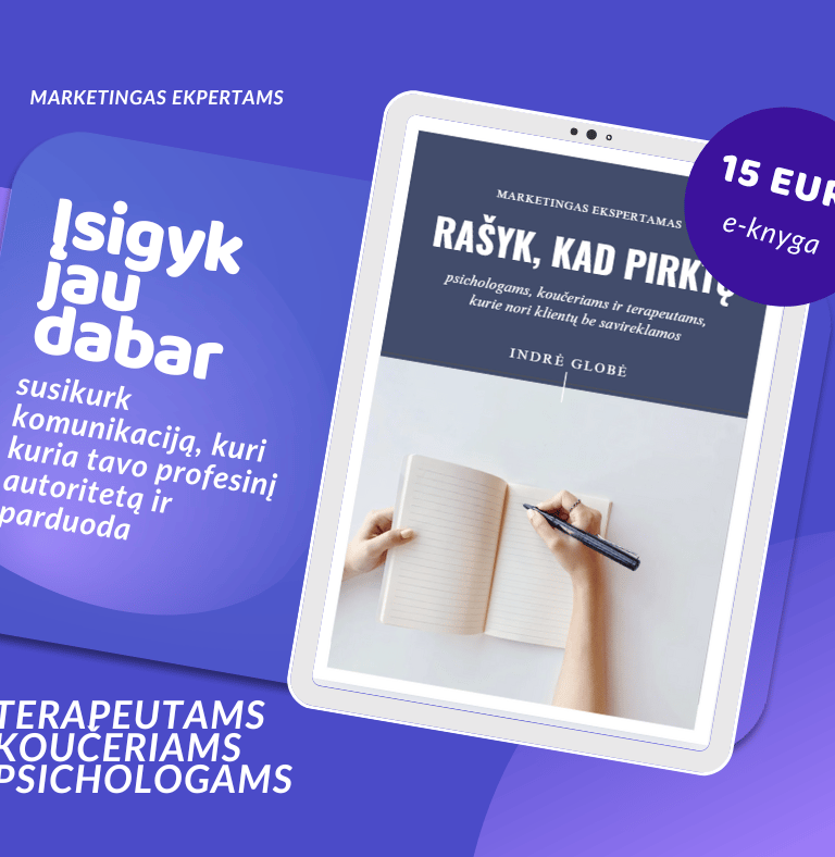 Esu el. knygos „Kaip rašyti, kad pirktų“ autorė, ICF ACC koučerė, komunikacijos strategė ekspertams ir marketingo specialistė, padedanti psichologams, koučeriams bei terapeutams kalbėti apie savo paslaugas be savireklamos. Mano darbas – išskaidyti sudėtingą komunikacijos ir marketingo procesą į paprastas formules ir aiškius žingsnius, kuriuos galima pritaikyti iškart. O ypač tada, kai specialistams trūksta marketingo žinių.